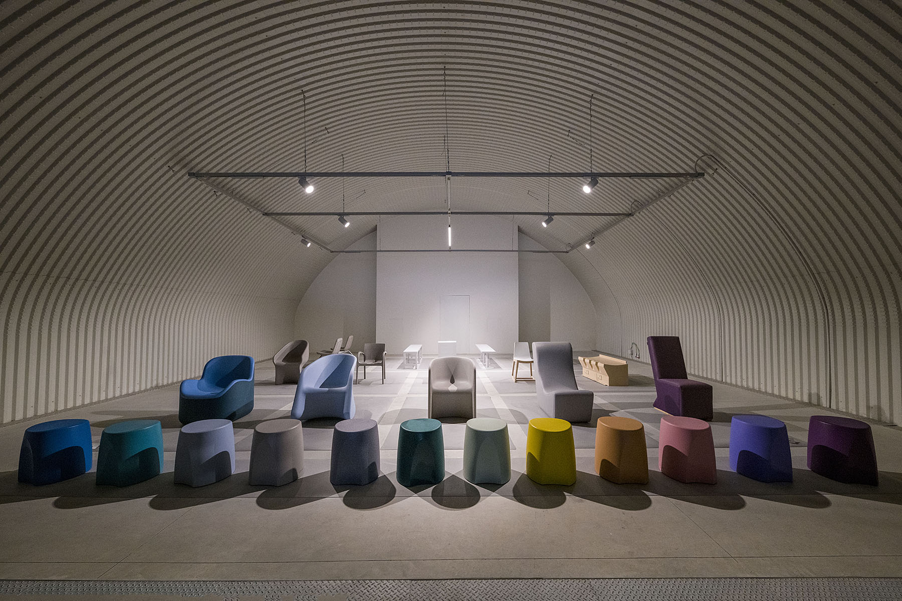 Un ottimo scatto che coniuga il rigore, la precisione, con il contrasto tra il cromatismo degli sgabelli e il monocromatismo della struttura.