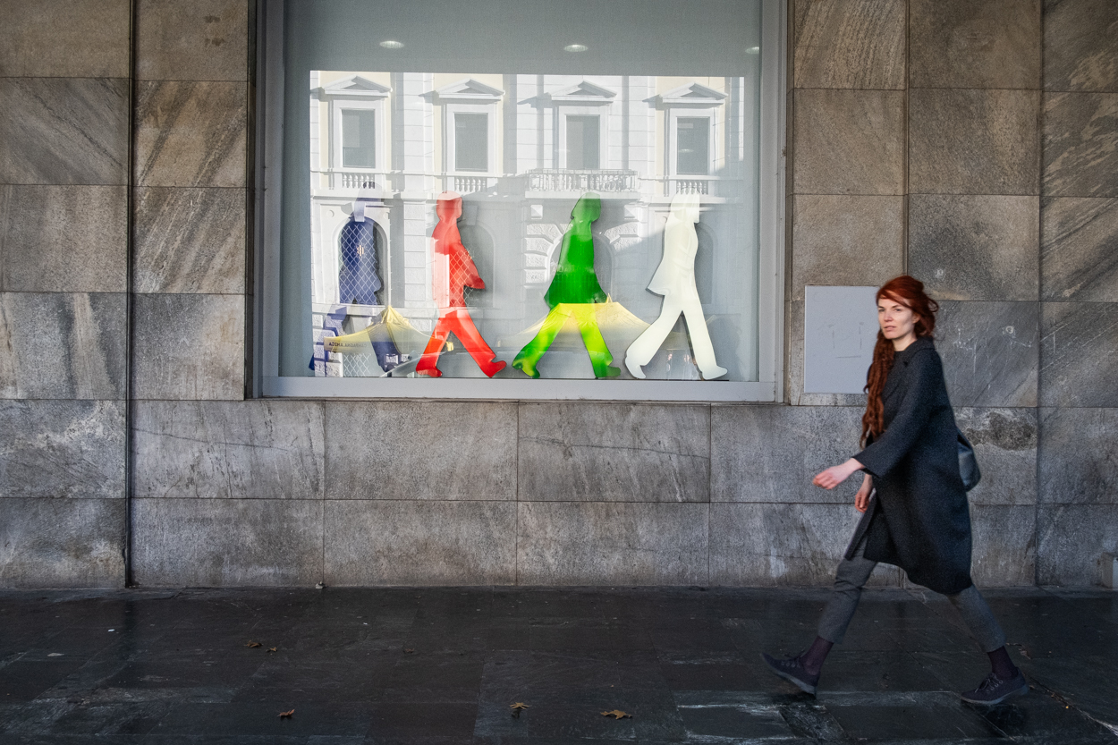 La vetrina ha qualche riflesso di troppo che disturba un po', ma il quartetto che cammina (i Beatles?) accordati alla passante funziona...