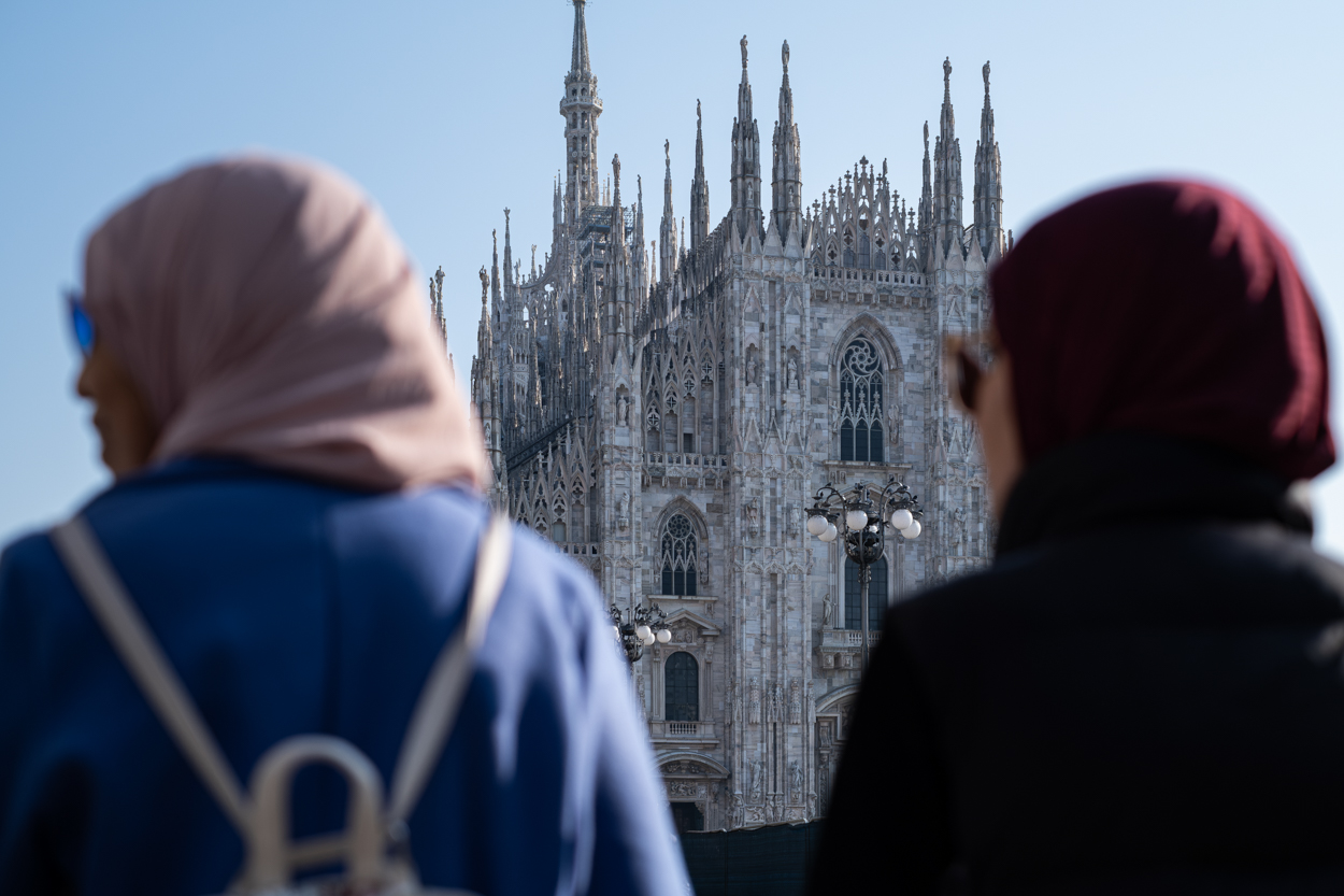 L'intenzione di fotografare un frammento del Duomo tra due figure umane a far da cornice la trovo valida. Ma se il soggetto principale è il Duomo, hai dato troppo spazio alle due donne sfocate e di spalle limitando così la profondità e la percezione spaziale del monumento. Quindi una minore inclusione delle persone avrebbe dato più visibilità al monumento.