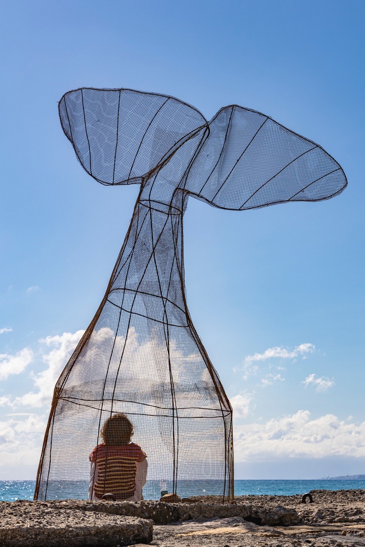 Una persona seduta all'interno della base di una grande scultura in rete metallica che riproduce una coda di balena, con il mare e il cielo azzurro sullo sfondo. L'installazione è un'opera in rete metallica a forma di coda di balena, situata sul molo di Camogli, in Liguria. _________________ Giancarlo Restuccia |