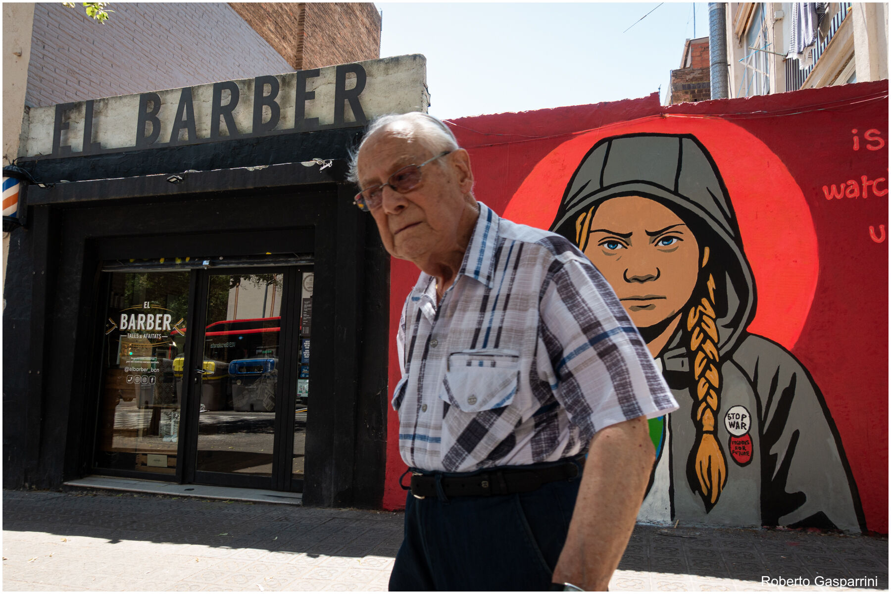 Ne faccio una doppia lettura: il signore che non ha bisogno più di tanto dell'opera del parrucchiere, sempre lui che volge le spalle anche ad una Tumberg minacciosa, forse troppo lontana dalla sua cultura generazionale; la sua espressione tra il perplesso e l'indifferente parla per lui.