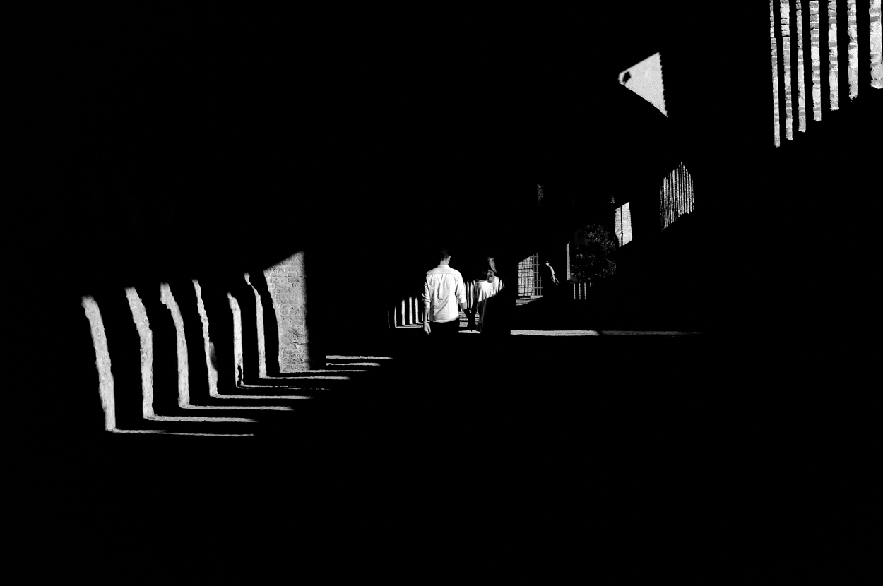 Mi piace il ritmo ripetitivo di luci e ombre che danno profondità con la persona inserita al centro che diventa il fulcro dell'immagine.