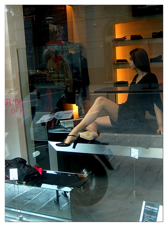 una pokezza di messaggio la riscontravo ank'io...ciò ke ho voluto ottenere a momento dello scatto, sono le gambe del manikino ke sembrano poggiate sul sellino dello scooter parkeggiato fuori dalla vetrina..