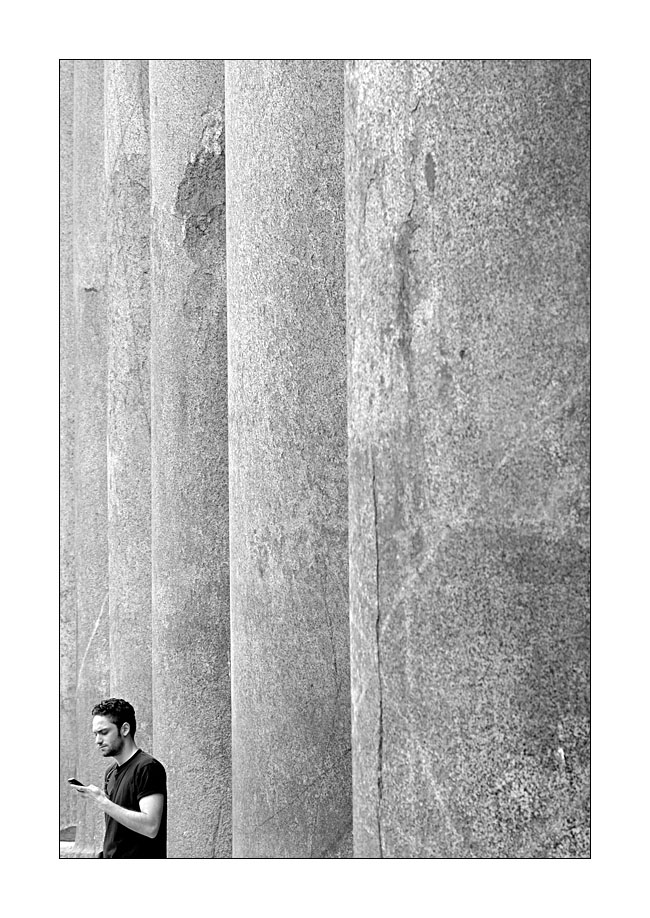 La foto escprime la piccolezza delle abitudini tecnologiche di oggi in contrasto con l'imponenza del passato e delle sue antichihtà. Il punto di vista è estremo, e come tale può essere odiato o amato. A me personalmente piace, ma per una questione di leggibilità della foto avrei spostato il soggetto un centimetro a destra, in modo da non relegarlo completamente all'angolo del fotogramma.