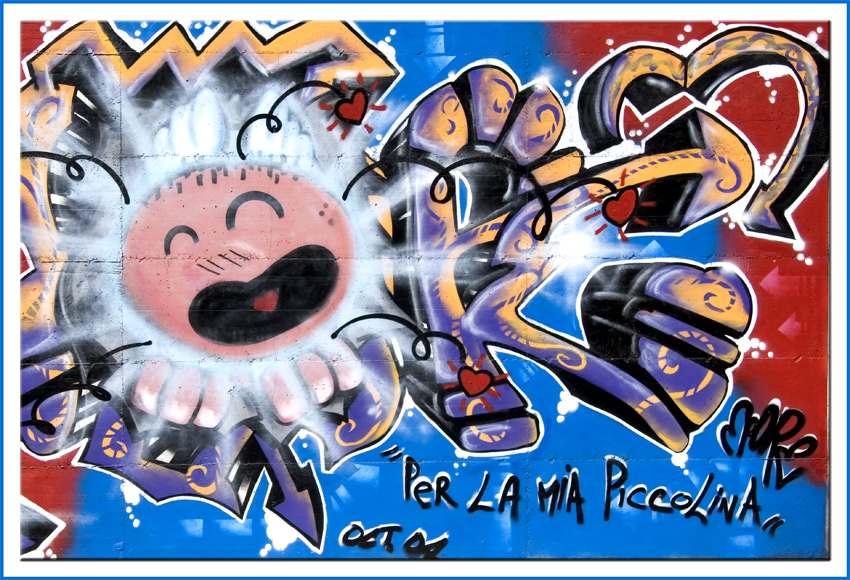 Hai colto un bel graffito urbano, un messaggio stranamente solare e innocente per un graffito. Per fortuna si vedono le linee del cemento che rendono limmagine meno riproduzione e più foto.