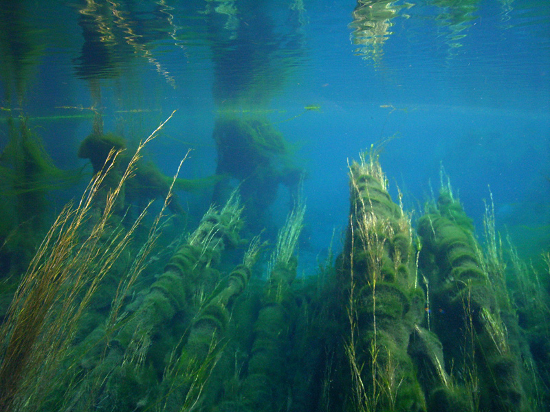L'ho scattata in una sorgente naturale di acqua potabile, appena 50 cm. sotto il pelo d'acqua. La componente biancastra e verdastra in superficie è data da alche unicellulari e dalla diffusione di una luce color gesso