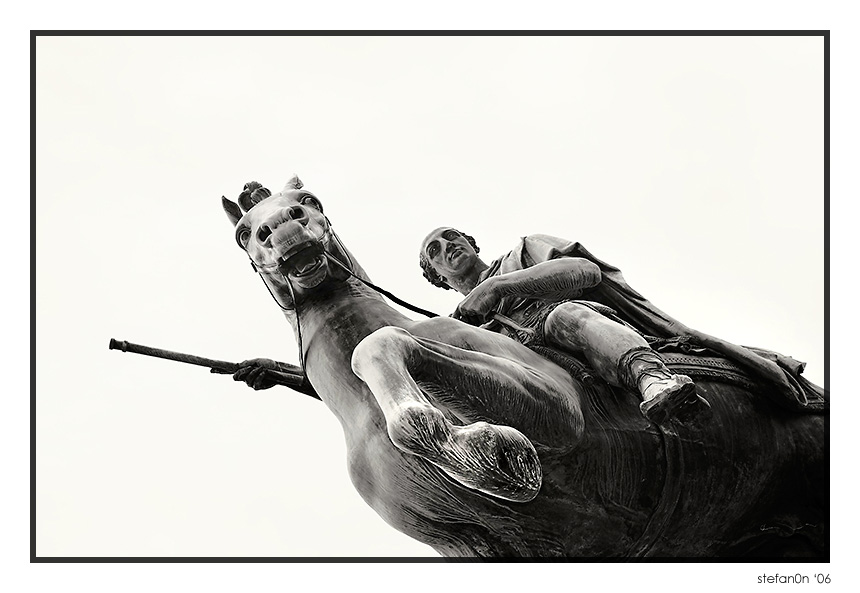 Bella prospettiva e bel punto di ripresa. Bellissimo lo zoccolo del cavallo ottimamente illuminato che sembra uscire dallo schermo. Cielo bianco panna senza traccia di nuvole, trasforma l'immagine quasi in una astrazione. Grande! Ok!