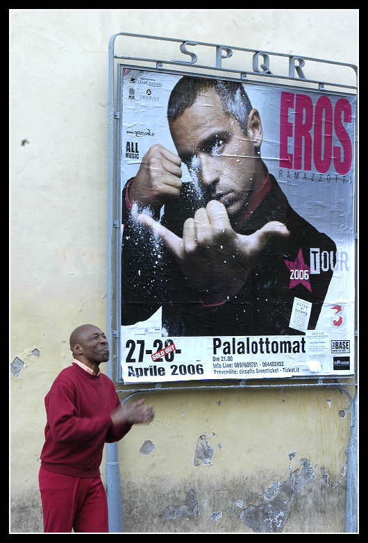 anch'io non avrei tagliato le gambe...però non avrei tagliato nemmeno il manifesto che è parte fondamentale nella foto. Forse giusto un paio di passi indietro per prendere il tutto! Ok!