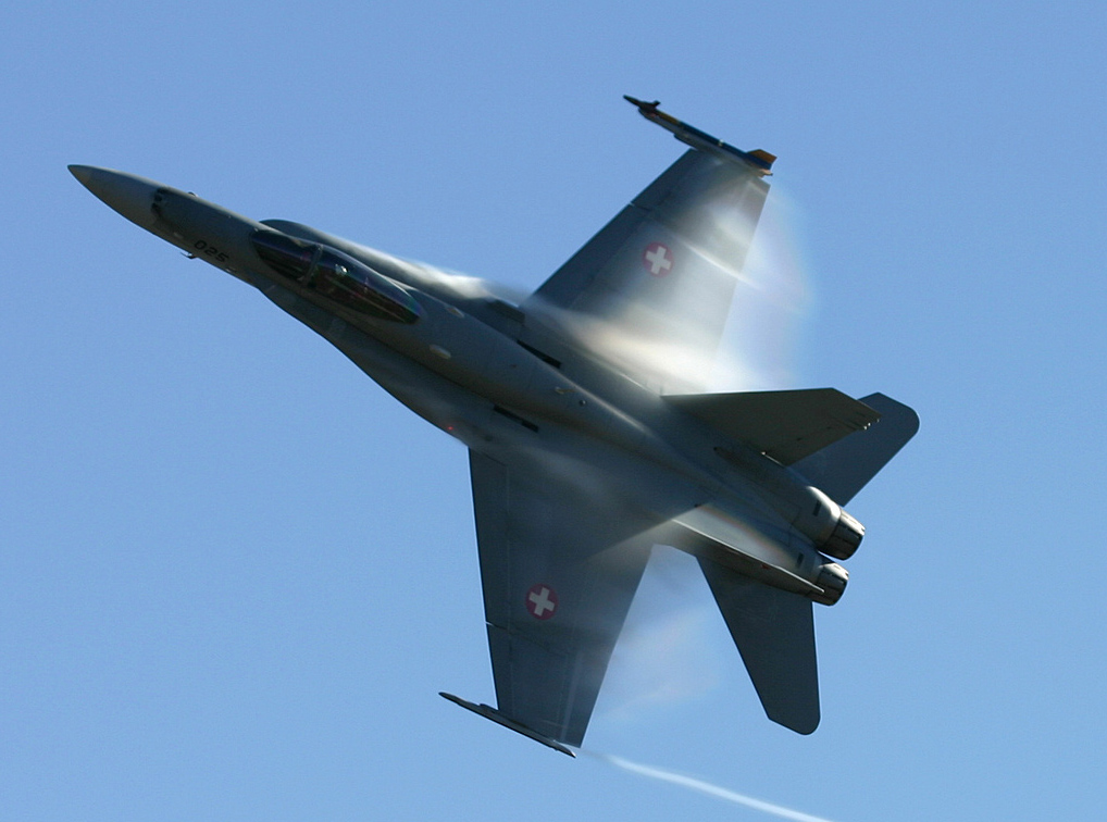 Un F-18 vira ad alta velocità facendo bruciare l'aria al contatto con la superficie alare.