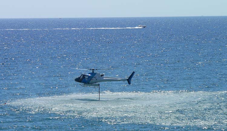 Trovo che l'immagine manchi molto di definizione, lo vedo sull'elicottero. A parte questo, e l'orizzonte che pende un pò a sinistra, la composizione è afflitta da una luce troppo forte che rende il mare toppo chiaro e l'elicottero in ombra. Il particolare del motoscafo aggiunge poco alla composizione. Io, se possibile, avrei zoomato di più sull'elicottero, quasi a farlo riempire l'inquadratura.