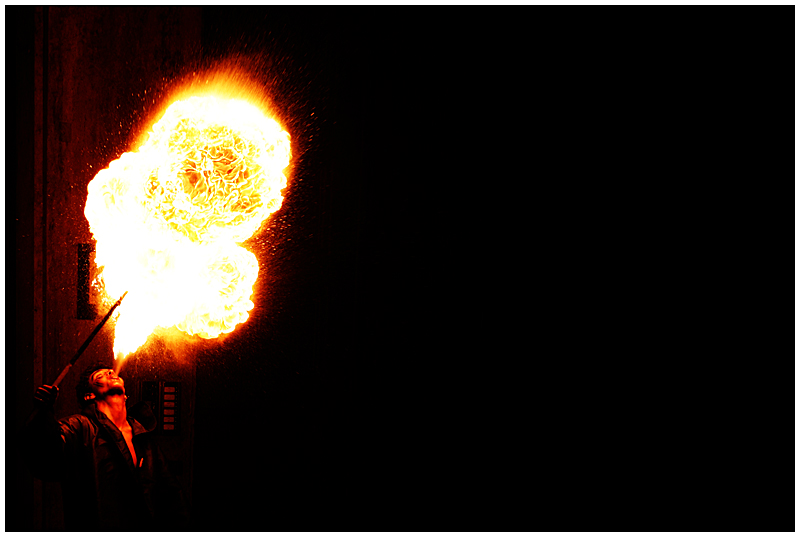 Il cerchio di luce rossa che illumina il viso del mangiafuoco è spettacolare, come spettacolare è l'enorme fiammata che si leva dalla bocca. Forse è stata davvero saturata, ma per me il colore ci sta tutto, così come il taglio, pur estremo, che lascia immaginare la possibilità di fiamme ancora più estese.