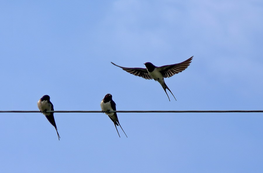 Ottima anche perchè le due rondini già posate sembrano osservare quella in arrivo (o in partenza) con espressione interessata. Ok!