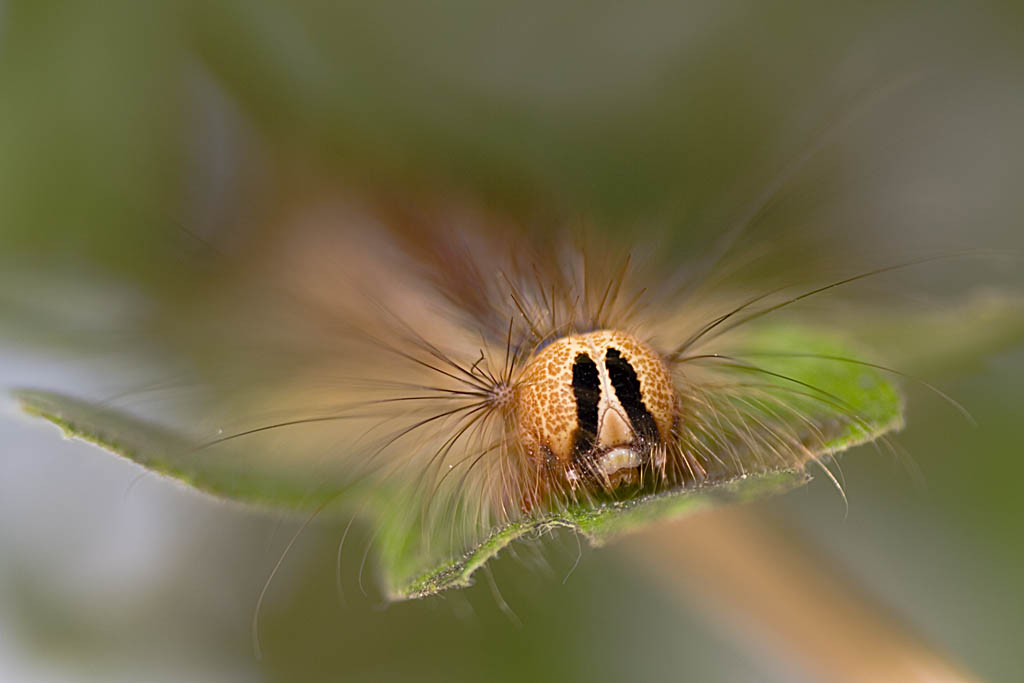Molto bella e buona la scelta di scattare a tutta apertura in modo da avere a fuoco solo il "faccione" del bruco.