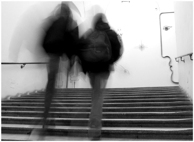 Molto bella l'idea del movimento. Trovo molto curiosa ed intrigante la faccia appesa al muro che sembra guardare, congelata, gli altri muoversi.