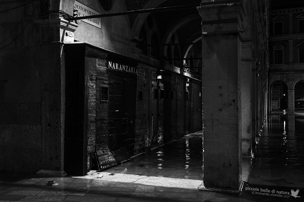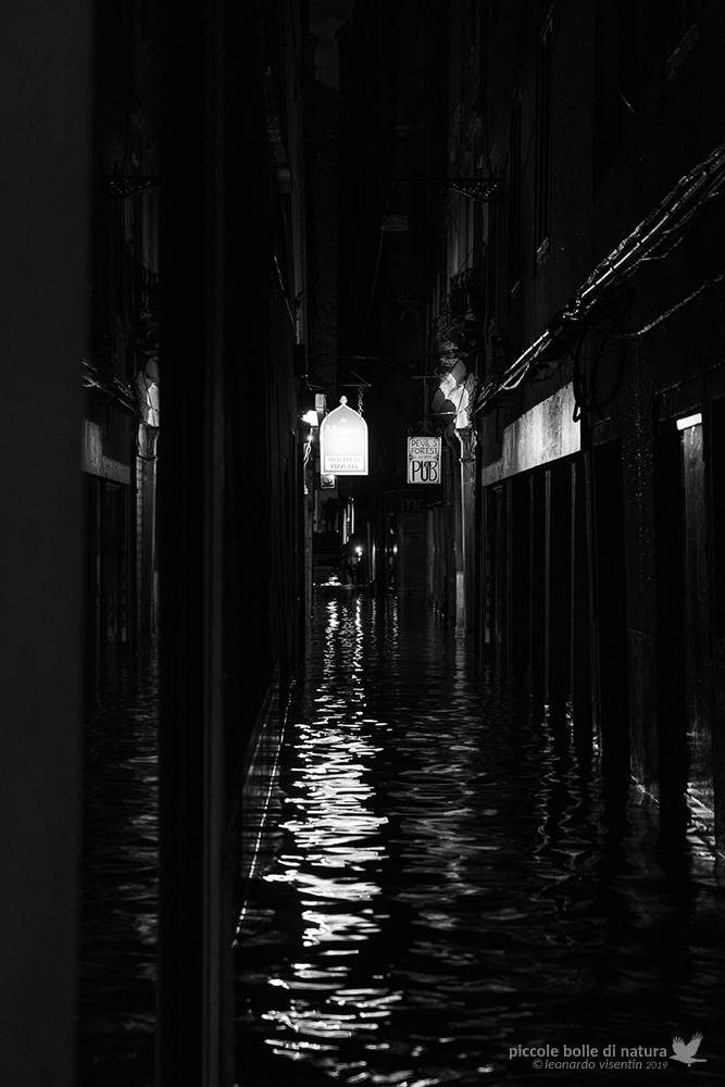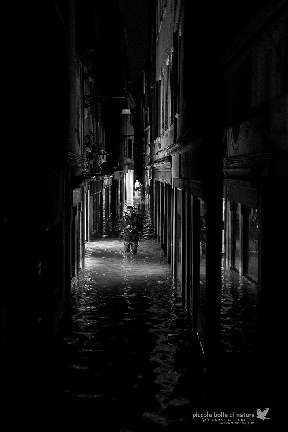 Venezia al buio, quasi silente, immersa in 50 centimetri di acqua (50 dal pavimento delle calli, tecnicamente non so il valore assoluto in quel momento). Una lenta processione di qualche decina di persone, fotografi, agenti di polizia, esercito, protezione civile, turisti, residenti, titolari di attività commerciali in ginocchio (figurato, al momento, visto il livello di monossido di diidrogeno perdonate la concessione). Passi lenti e misurati, perché il divario tra pelo dell'acqua e limite dello stivale oscilla tra 4 e 10 centimetri, a seconda del passo e del fondo irregolare. Irreale e surreale.
