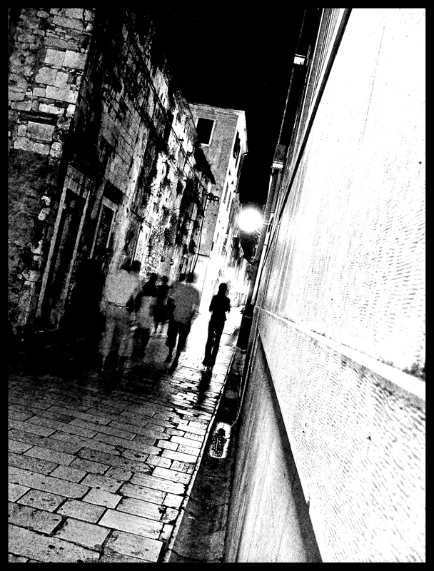 scattata a Zadar in Croazia, avevo dimenticato il cavalletto, ho messo il trepiede piccolo e mi sono appoggiato al muro, una gamba del trepiede slitta in avanti, guardo l'inquadratura così composta e me ne innamoro, aveva assunto una prospettiva che mi ha convinto a portarla in bn, mi da l'idea di una scena di arancia meccanica, avete presente la scena del vecchio barbone nel tunnel?