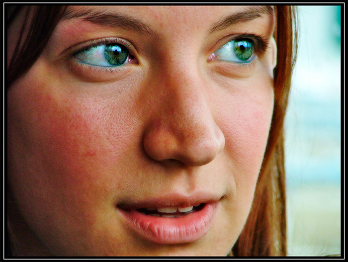 Posso chiederti, se non sono indiscreto, se la modella porta le lenti a contatto? Si spiegherebbe il riflesso eccessivo sugli occhi.