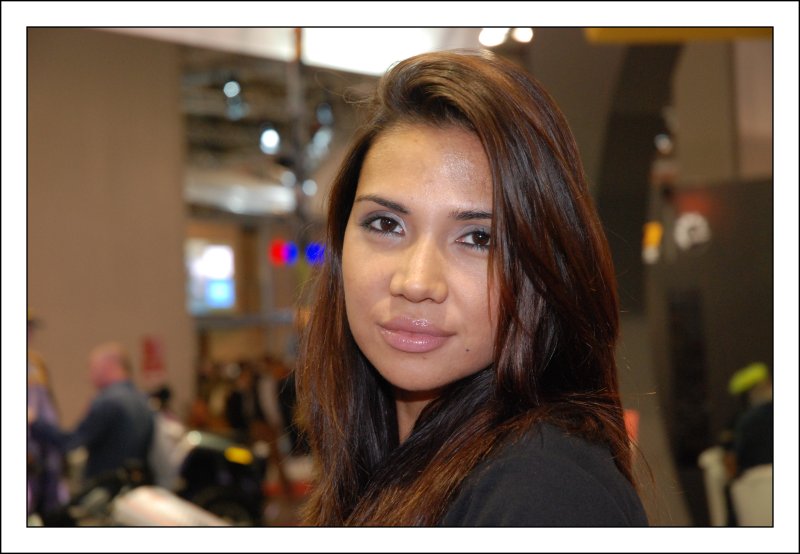 Era una delle ragazze che si alternavano sulle moto, in quel momento era seduta a un desk, mi piaceva il suo sguardo e l'ho fotografata, lei si è prestata, è poi la medesima della 27.....da tutt'altra angolazione.